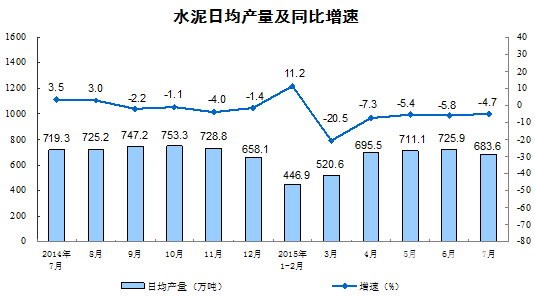 根據國家統計局公布的數據顯示,2015年7月份水泥產量21,193萬噸,同比下降4.7%;2015年1-7月份全國規模以上水泥產量129,059萬噸,同比下降增長5%,降幅較前6個月有所減緩。