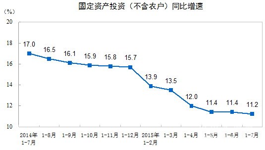 2015年1-7月份,全國固定資產投資(不含農戶)288,469億元,同比名義增長11.2%,增速比1-6月份回落0.2個百分點。從環比看,7月份固定資產投資(不含農戶)增長0.75%。