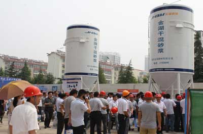 會上,山東金湖新材料科技有限公司、天元建設集團負責人分別作了發言。與會人員觀看了預拌砂漿宣傳片,現場觀摩了北城新區魯商中心工地預拌砂漿施工現場。
