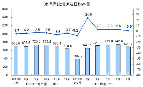 統計局數據顯示,2016年1-7月份全國規模以上水泥產量13.23億噸,同比增速為2.8%;7月份水泥產量2.14億噸,同比增長0.90%;環比上月下降3.89%。