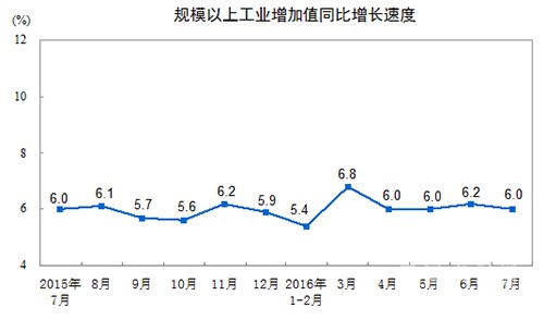 2016年7月份,規模以上工業增加值同比實際增長6.0%(以下增加值增速均為扣除價格因素的實際增長率),較6月份回落0.2個百分點。從環比看,7月份,規模以上工業增加值增長0.52%,比上月加快0.02個百分點。1-7月份,規模以上工業增加值同比增長6.0%。