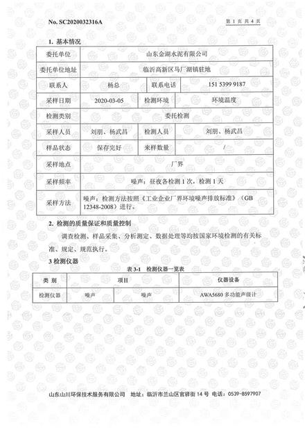 山東金湖水泥有限公司2020第一季度檢測報告公示